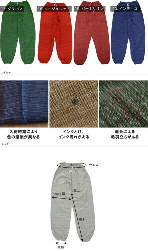 Color variations サイズ(平置き採寸) ウエスト ヒップ わたり幅 裾幅 股上 股下 約60〜80cm 約110cm 約35cm 約12〜17cm 約36cm 約74〜77cm コメント ナチュラルなコットンのアラジンパンツ。