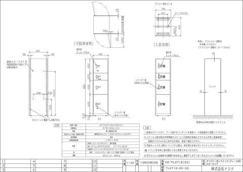商 品 詳 細商品名【KS-TLHT18-SC ユニットタイプC ステンレス扉】 宅配ボックス/前入後出/コンピューター式サイズ・重量●本体サイズ:H1800×W501×D601 ●98.0kgユニットのボックス構成ボックス内寸法ユニットタイプC(4段構成)※上から順:ボックスタイプ:内寸 1番目:Sボックス:H410×W375×D515 2番目:SSボックス:H200×W375×D515 3番目:Sボックス:H410×W375×D515 4番目:Mボックス:H580×W375×D515(※非常脱出機構付き)材質本体:スチール(SECC)、焼付塗装メタリックグレー 扉:ステンレス(SUS304)、ヘア—ライン仕上げ、クリア塗装 化粧板:ステンレス(SUS304)、ヘア—ライン仕上げ、クリア塗装仕様使用環境:屋内周囲温度-10℃〜+40℃ 電源:単層100V(50/60Hz) アース:第3種接地相当 定格消費電力:67W(30ボックス) 登録住戸数:150戸(オプション400戸) 識別方法:暗証番号方式 施開錠方法:CPUによる電気式施開錠、管理キーによる手動開錠 扉センサー:リミットスイッチ方式 安全機能:非常時緊急開放機能、荷物長時間滞留警報機能 基本性能:受け取り 操作方法:テンキーパネルボタン 着荷連絡:テンキーパネル住戸番号表示 預り印発行:お届け時に手動にて押印 停電保証:メモリーバックアップ機能付き特長●荷物が届くとテンキーパネルに部屋番号が表示され、着荷を知らせます。